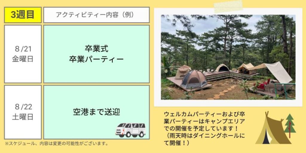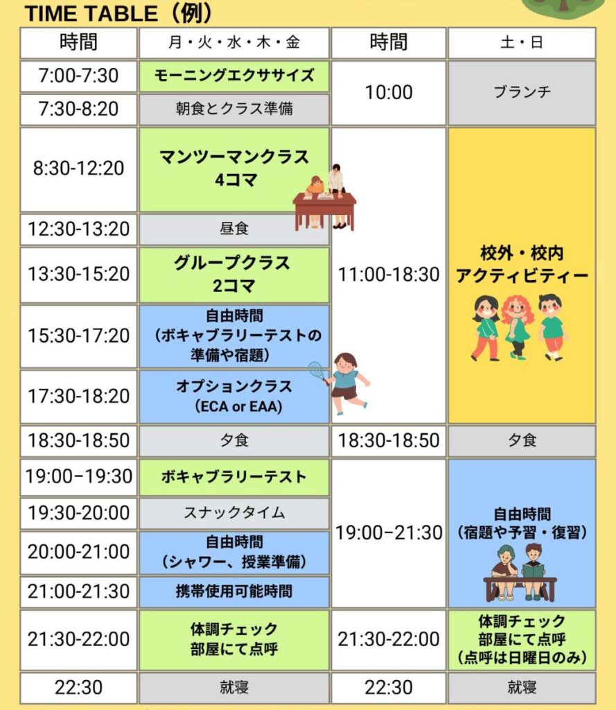 それ以外の時間ではボキャブラリーテストや日記作成の時間、オプションのアクティビティや週末アクティビティなど英語をしっかり学びながら楽しく交流もできる要素が盛り込まれています。