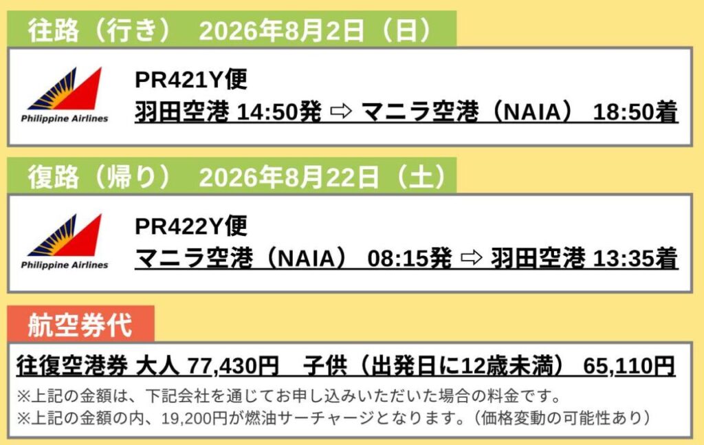 ※参考マニラ・クラーク空港からの送迎サポートあり