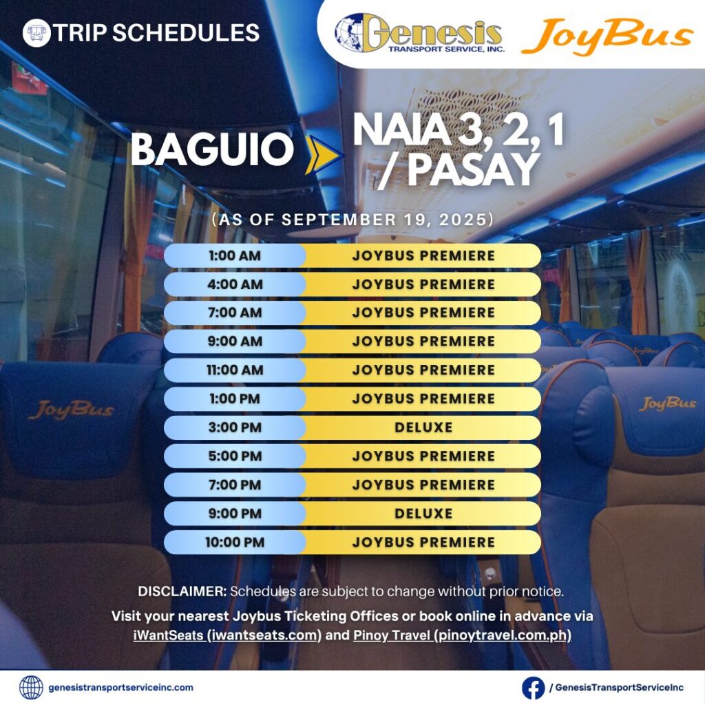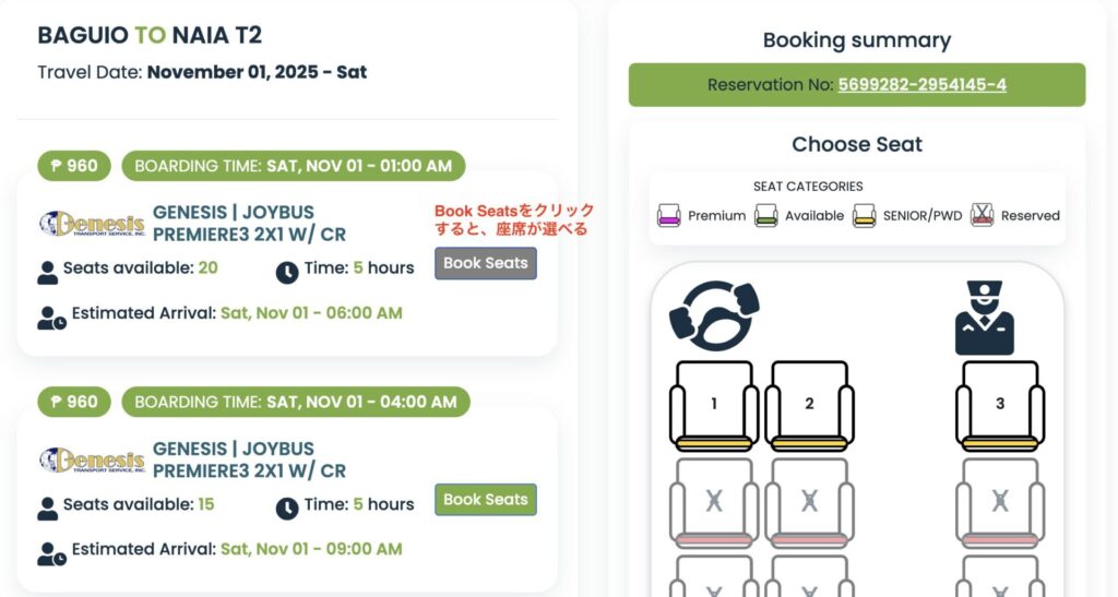 ルートによってはオンライン予約に対応していない場合があります。また、一部情報ではバギオ発マニラ空港行きはオンライン購入不可とされている時期もありましたが、通常は予約サイトを通じて可能です。
