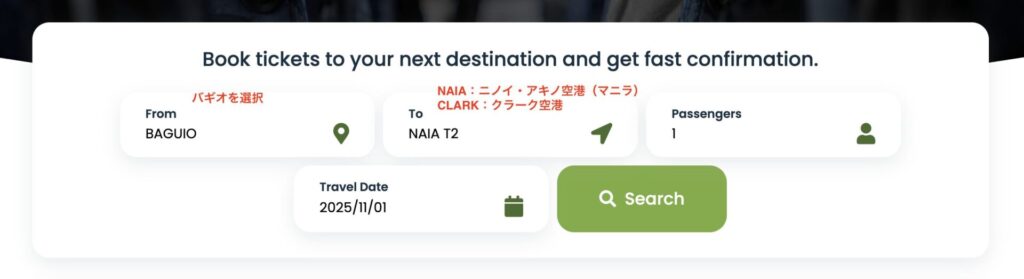 出発地(例:Baguio)、目的地(例:NAIA Terminal 3, 2, 1 または Pasay)、および希望の出発日を選択します。
