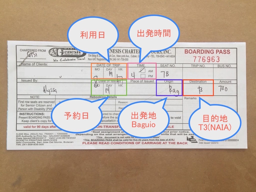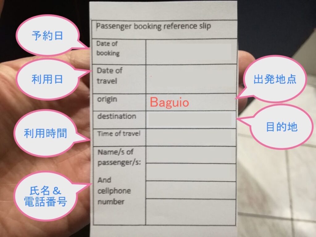 印刷したE-チケットまたはモバイル画面を、出発時刻の30分〜60分前までにバギオのジョイバス・ターミナルのチケットブースに提示し、正式な乗車券に引き換える必要があります。