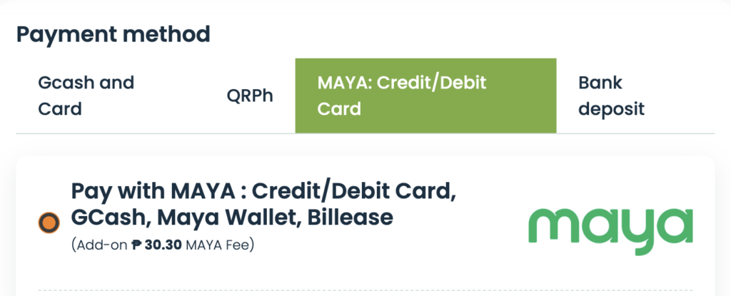 例:Show Payment Optionsを選択→MAYA: Credit / Debit Cardを選択するとクレジット情報が入力できます。