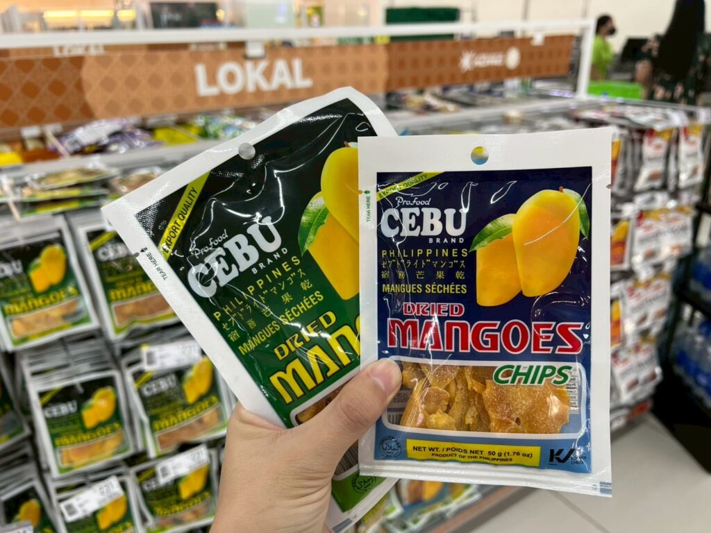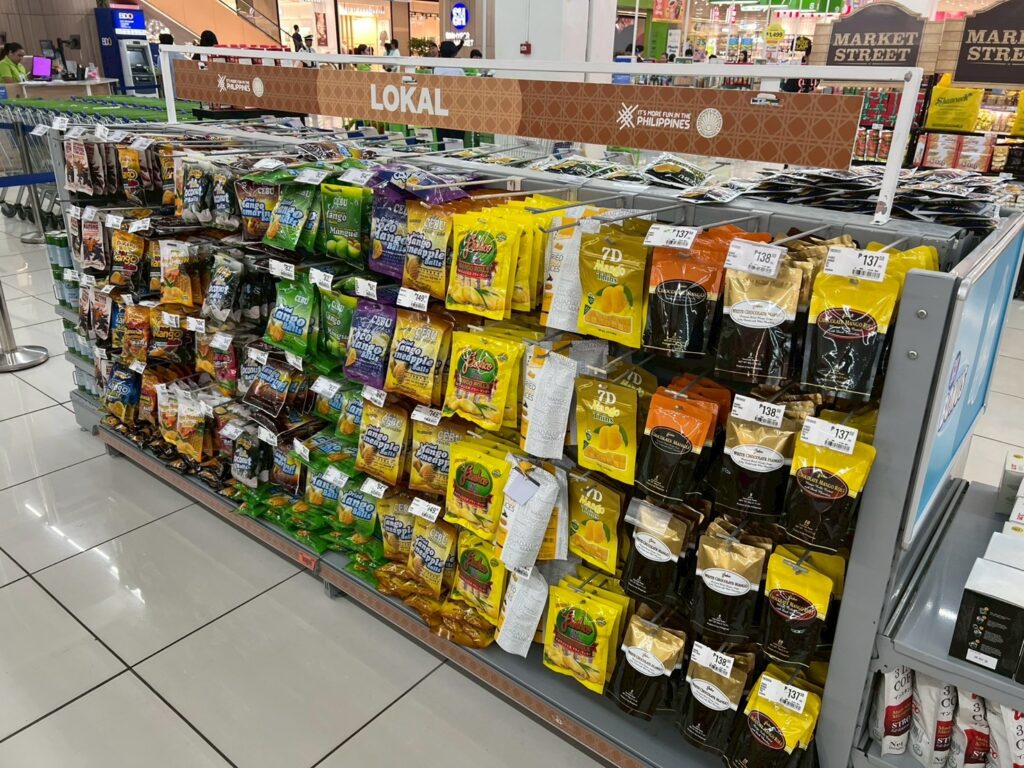 レジ横にある「LOKAL」と書かれた専用エリアには、お土産に最適なドライマンゴーやチョコレートが豊富に揃っています。特にドライマンゴーは13種類ものバリエーションがあり、定番から珍しいブランドまで一度にチェックできるのが魅力。スーパーの中にあるので、他のお買い物ついでにサッと寄れるのも便利なポイントです!