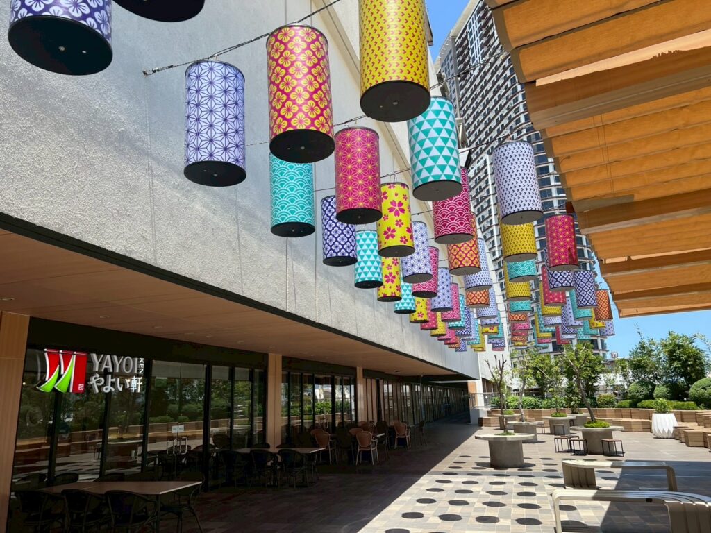 2階(L2フロア)の「Izakaya Terrace(居酒屋テラス)」は、天井から吊るされた無数の提灯があり。日本のお祭りのような空間が広がっています。また木目調の素材や、桜の花びらを装飾が施されており、モール全体が落ち着きのある洗練された日本の雰囲気に包まれています。