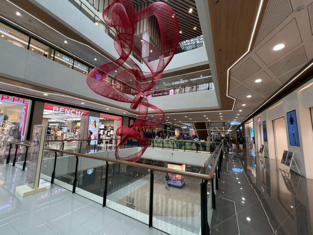 モールに一歩足を踏み入れれば、世界的なデザイナー、ケネス・コボンプエ氏が手がけた巨大なリボン状のアート作品「Linya(リニャ)」がお迎えしてくれます。