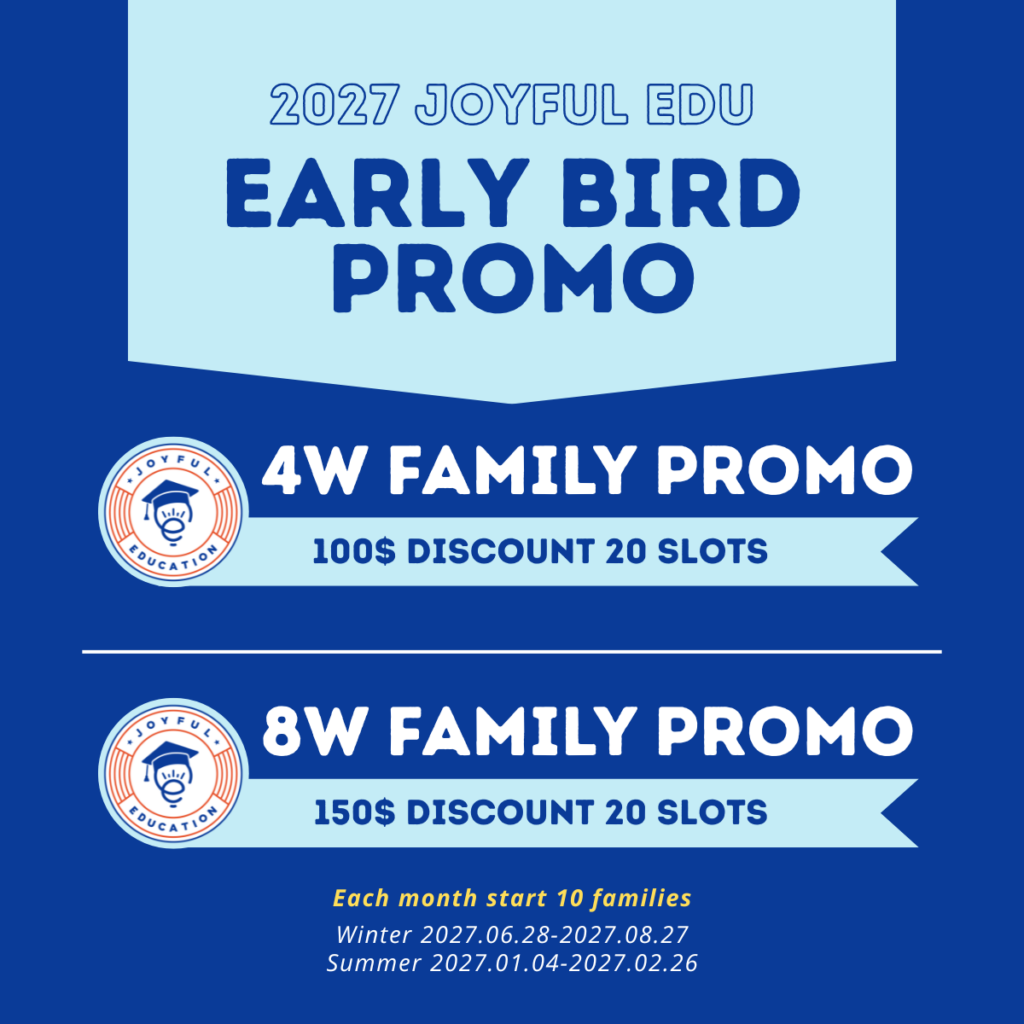 Joyfulにて2027年の夏季および冬季ピークシーズンの親子留学にご登録いただく方を対象に、下記の入学開始日ごと先着10組に、アーリーバード割引が適用されます。