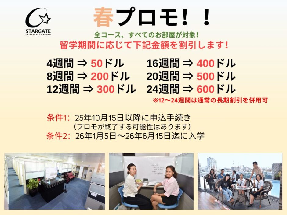 留学期間が長い人ほど割引が大きくなるチャンスです。是非この機会にご検討ください。