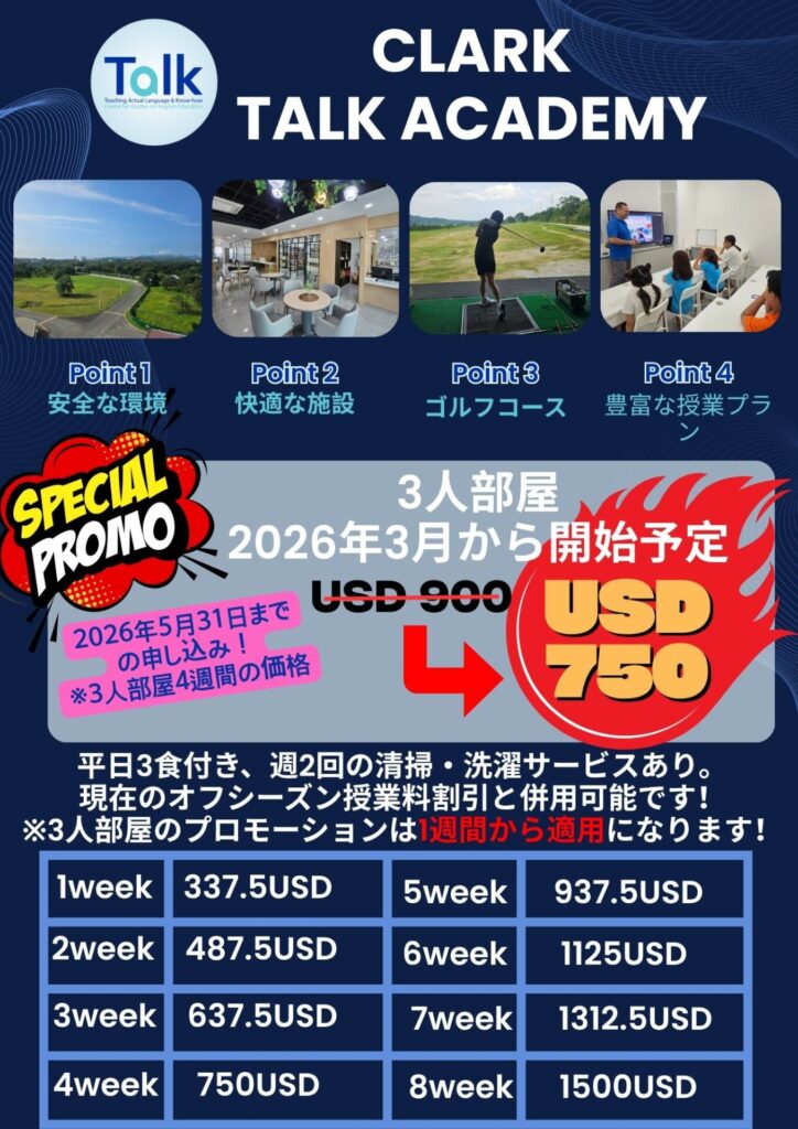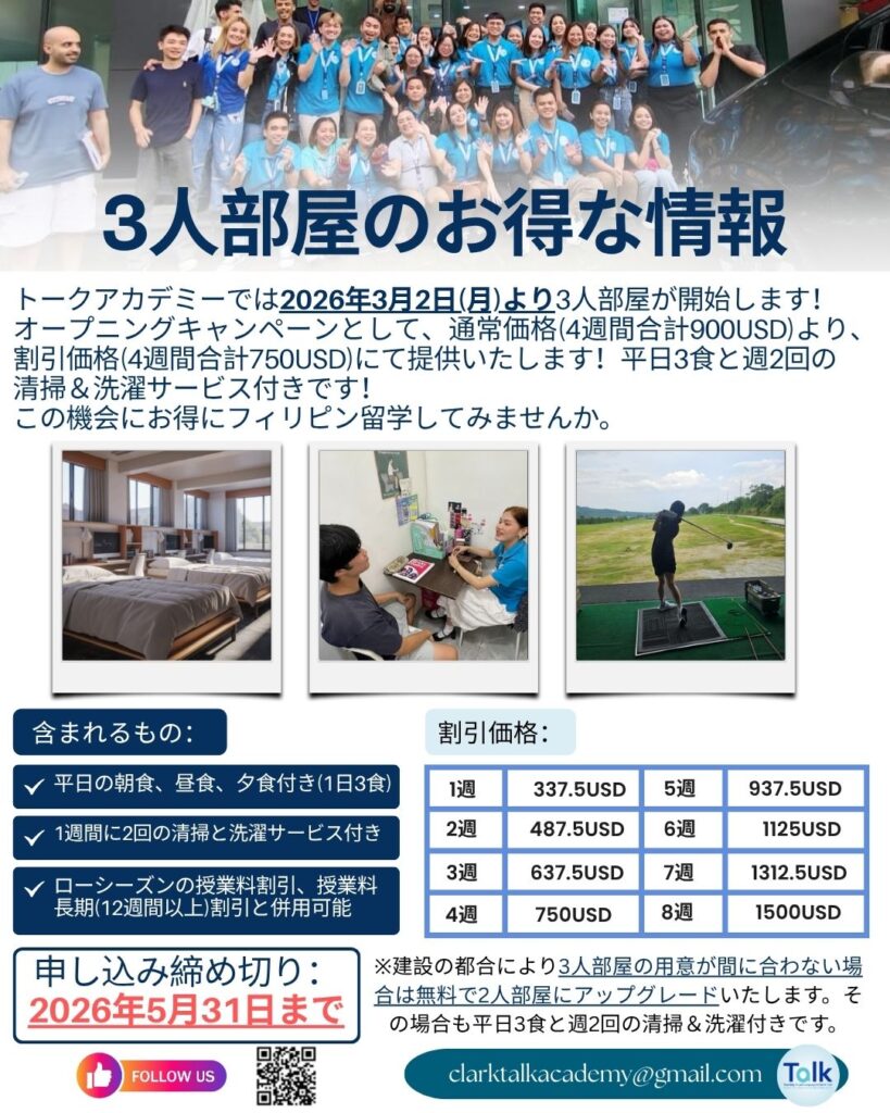 2026年3月より「3人部屋」プランが新登場します。通常価格900ドルが、特別価格750ドル(4週間)でご案内可能です。