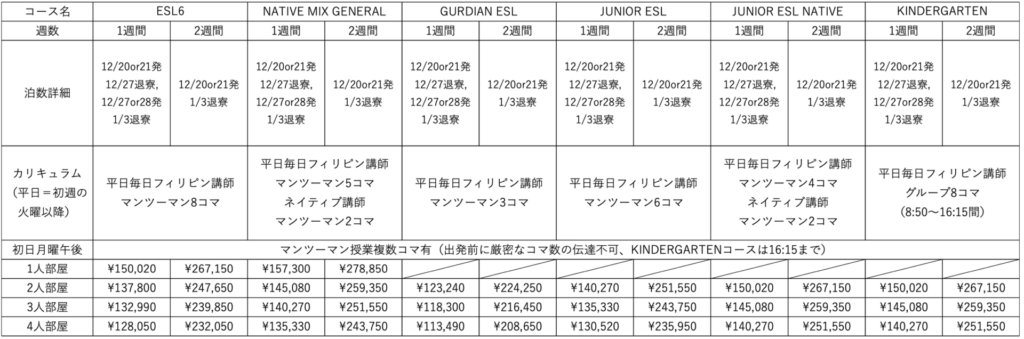 留学費用は、選択されるコースとお部屋タイプによって異なります。詳細は下図を参照ください。